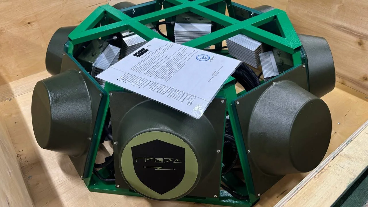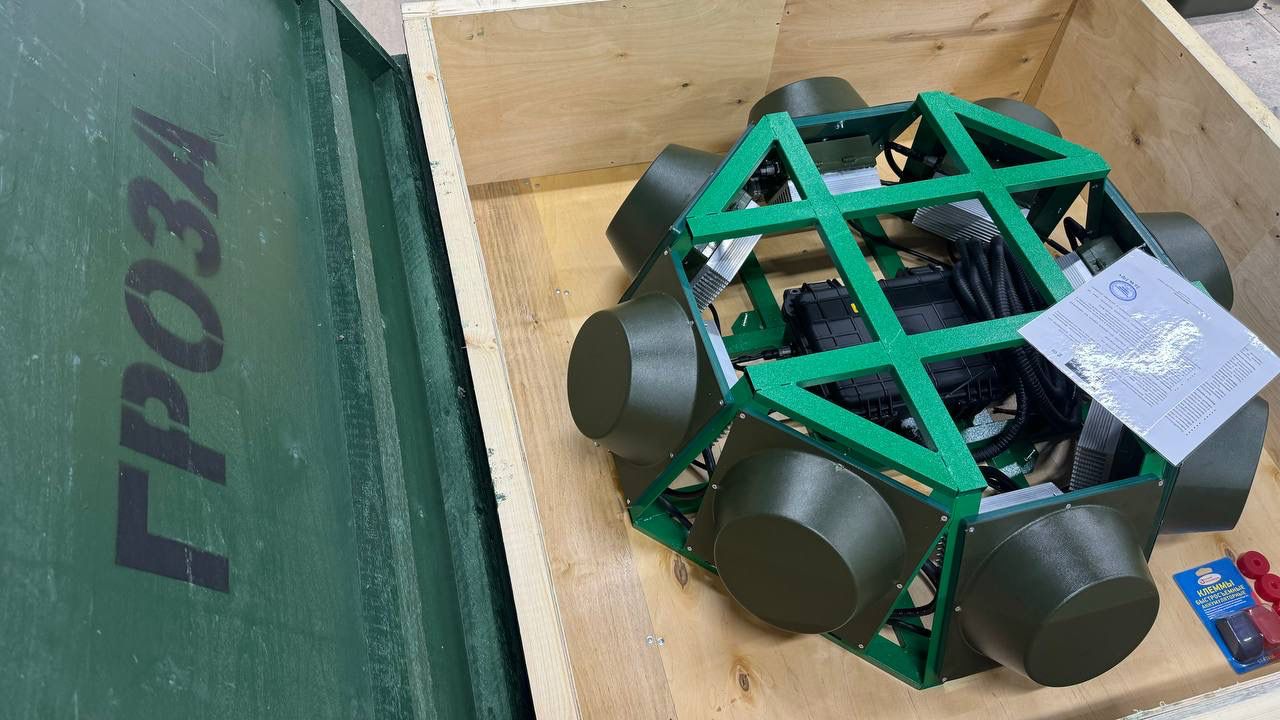 Подавитель БПЛА Гроза БРОНЯ относится к средствам РЭБ для защиты военной техники от атак FPV-дронов. Изделие включает 8 модулей радиопомех, размещённых на прочной стальной раме с предусмотренными точками крепления. Конструкция обеспечивает радиоподавление на 360 градусов по горизонтали и до 90 градусов по вертикали.