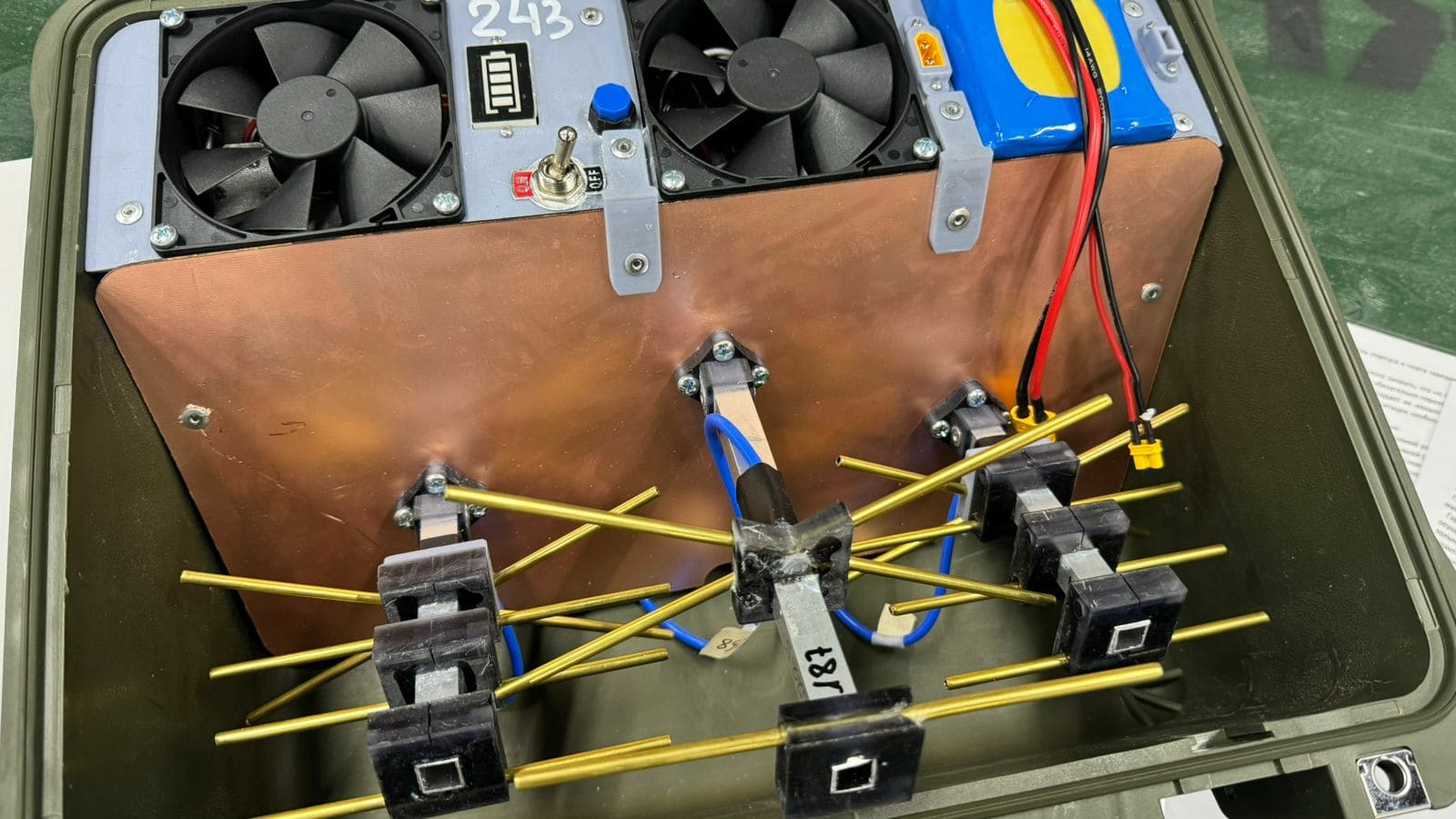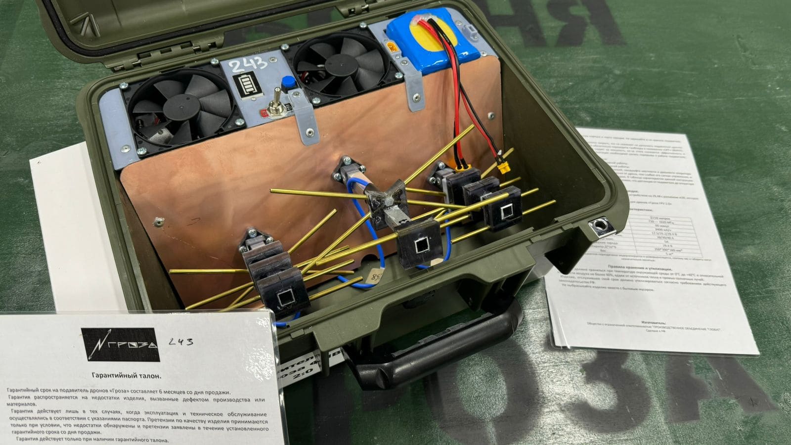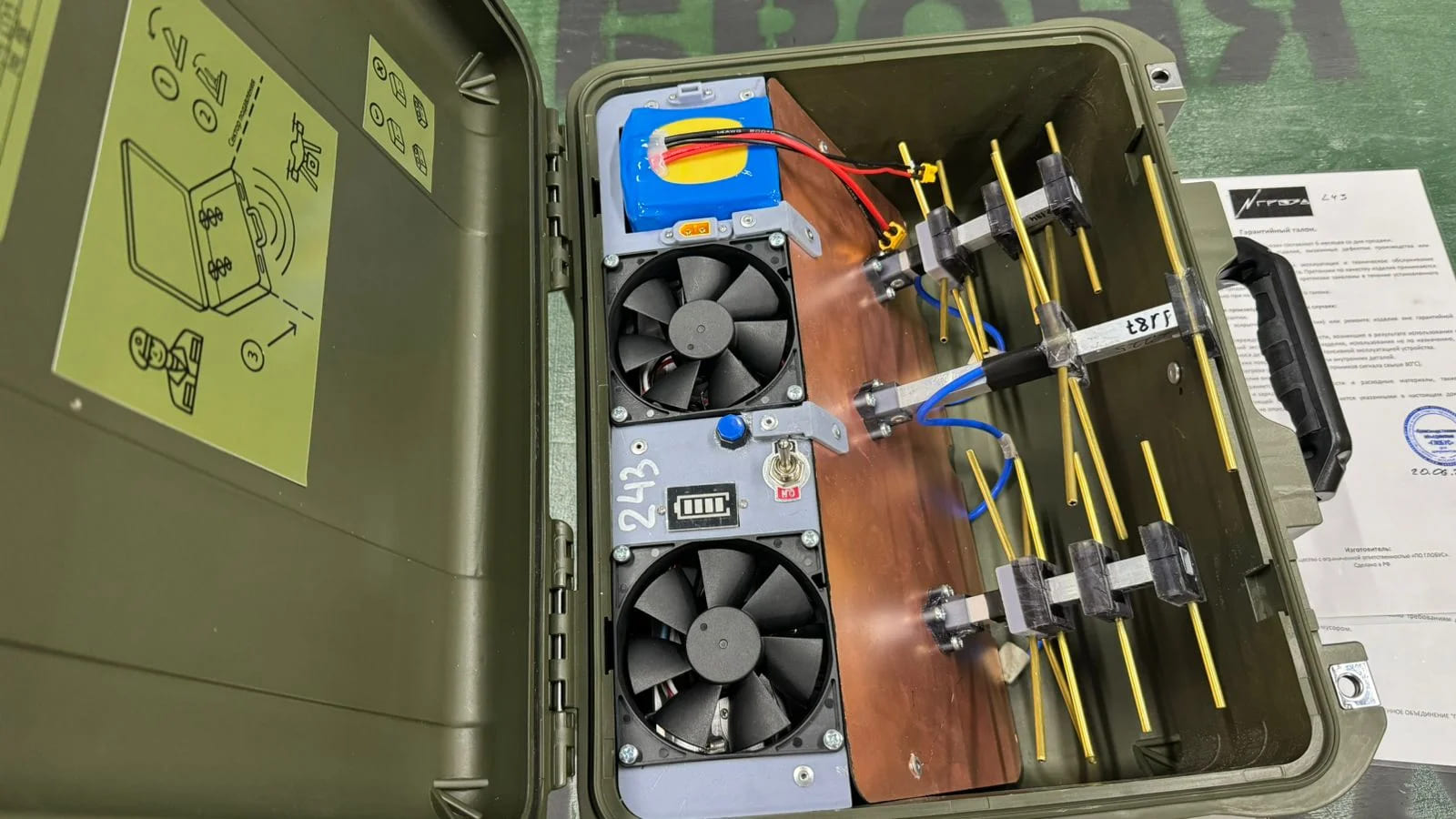 Устройство размещено в полностью герметичном противоударном кейсе оливкового цвета, защищённом от влаги, пыли и механических воздействий. Такая конструкция позволяет использовать подавитель в полевых условиях и при неблагоприятных погодных факторах.